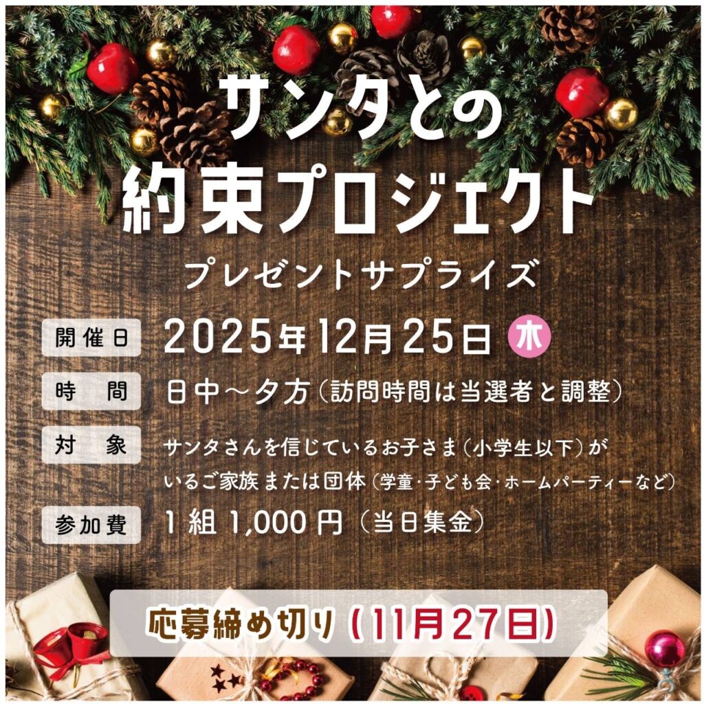 イベント案内 サンタとの約束プロジェクト サンタとの約束プロジェクト 2025開催日:2025年12月25日クリスマスが近づくと、子どもたちはサンタクロースに会えることを心から楽しみにしています。街のいたるところでサンタさんを見かけるけれど、本当に欲しいプレゼントをもらえるわけではありません。普通は、朝起きたら枕元にプレゼントが置いてあるものです。でも、フィン... famille