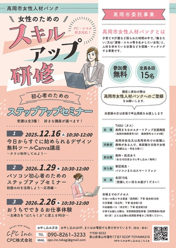 イベント案内 【高岡市・参加無料】女性人材バンクスキルアップセミナー CPC株式会社・ファミーユ株式会社 合同事業 高岡市女性人材バンクは、子育てや介護などで働く時間が限られている中でも「働きたい」と願う女性や、「資格やスキルを活かしたい」と考えている女性と、人材を求めている企業とを登録し、マッチングする事業です 子育てや介護などで時間に制約がある方でも、自分のペースで学べる3つのパソコ... famille