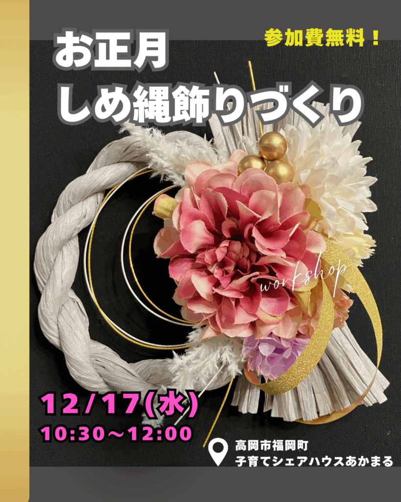 イベント案内 【参加無料】お正月しめ縄飾りづくり/高岡市 参加無料!【お正月しめ縄飾りづくり】お正月には欠かせないしめ縄飾り昨年大好評で今年は高岡で開催です!お正月を迎えるにあたり毎年用意される方も多いのではないでしょうか今年はこんなオシャレなしめ縄飾りで玄関を彩りませんか?自分で好きな材料を選んで、それぞれのお家にピッタリなしめ縄飾りに仕上げちゃいましょう!ゴールドのピック... famille