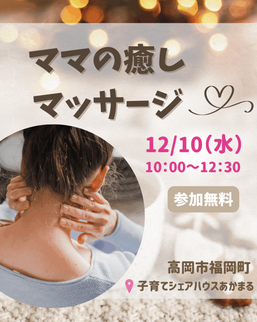 イベント案内 【参加無料】ママの癒しマッサージ/高岡市 \子育てママ必見/前回大人気のイベント!今回は高岡でママの癒しマッサージを開催します!簡単なアンケートに答えるだけで、参加無料!・・・・・・・・・・・・・・・・・・・・・・・・・・・・・・・・寒くなり体が冷えたり、抱っこや添い寝で体が痛い~というママの声をよく聞きます・・・今回は、ママたちへの癒し時間のプレゼントです!... famille