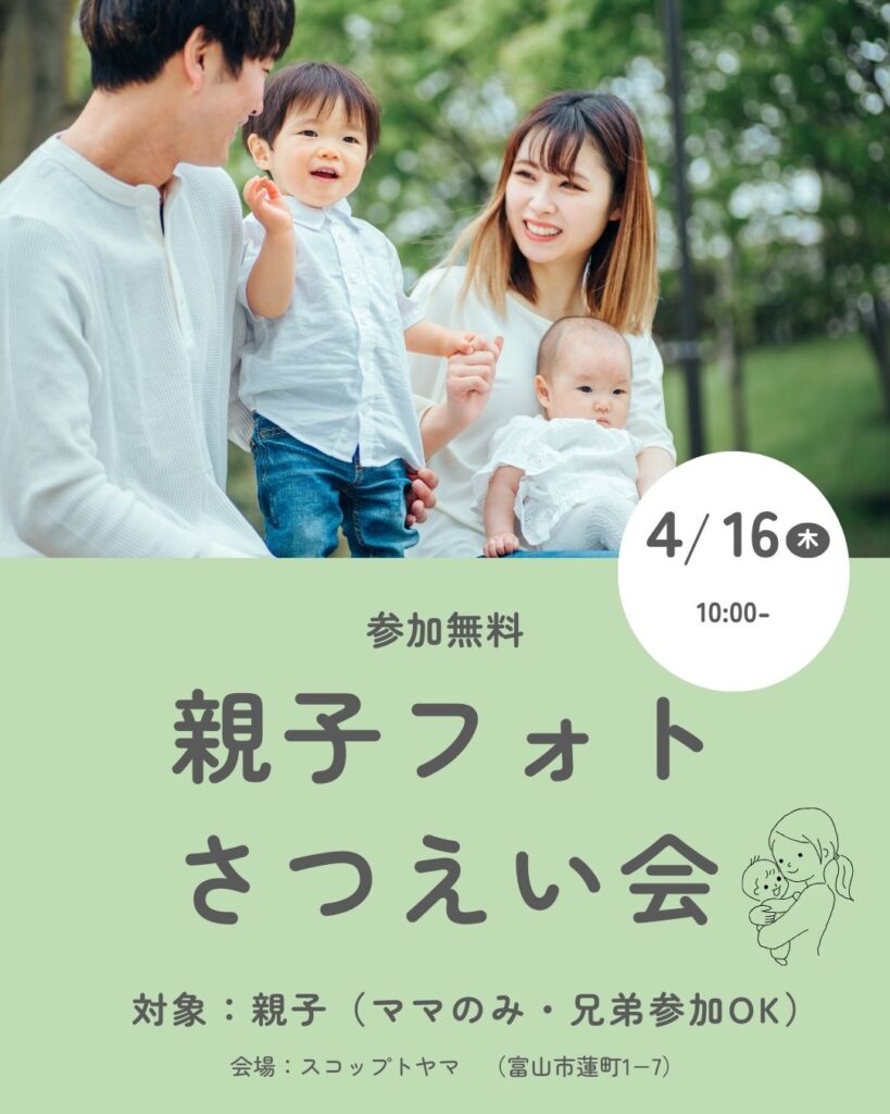 NEW! イベント案内 【参加無料】4/16親子フォト撮影会 親子フォト撮影会 in SCOP TOYAMA 春の心地よい季節に、親子の自然な笑顔を写真に残しませんか? 人気カメラマン おがちゃん による親子フォト撮影会を開催します✨ 今回は SCOP TOYAMA を会場に、晴れの日は開放感のある屋外で、雨の日はおしゃれな屋内スペースで撮影予定です。 撮影したお写... famille