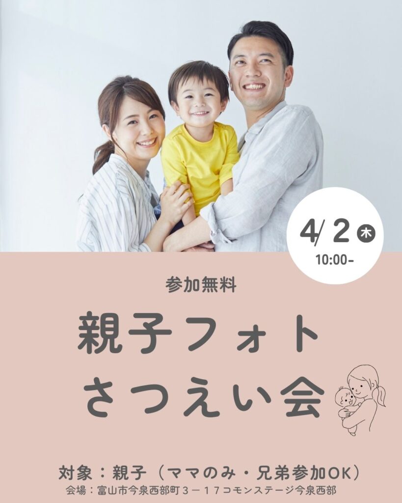 NEW! イベント案内 【参加無料】4/2親子フォト撮影会 親子フォト撮影会 in モデルハウス 春の思い出に、親子で素敵な写真を残しませんか? 人気カメラマン おがちゃん による親子フォト撮影会を開催します📷✨ モデルハウスの明るくおしゃれな空間で、自然な親子の姿を撮影します。 撮影したお写真は、データ2〜3枚をプレゼントいたします。 【日時】4... famille
