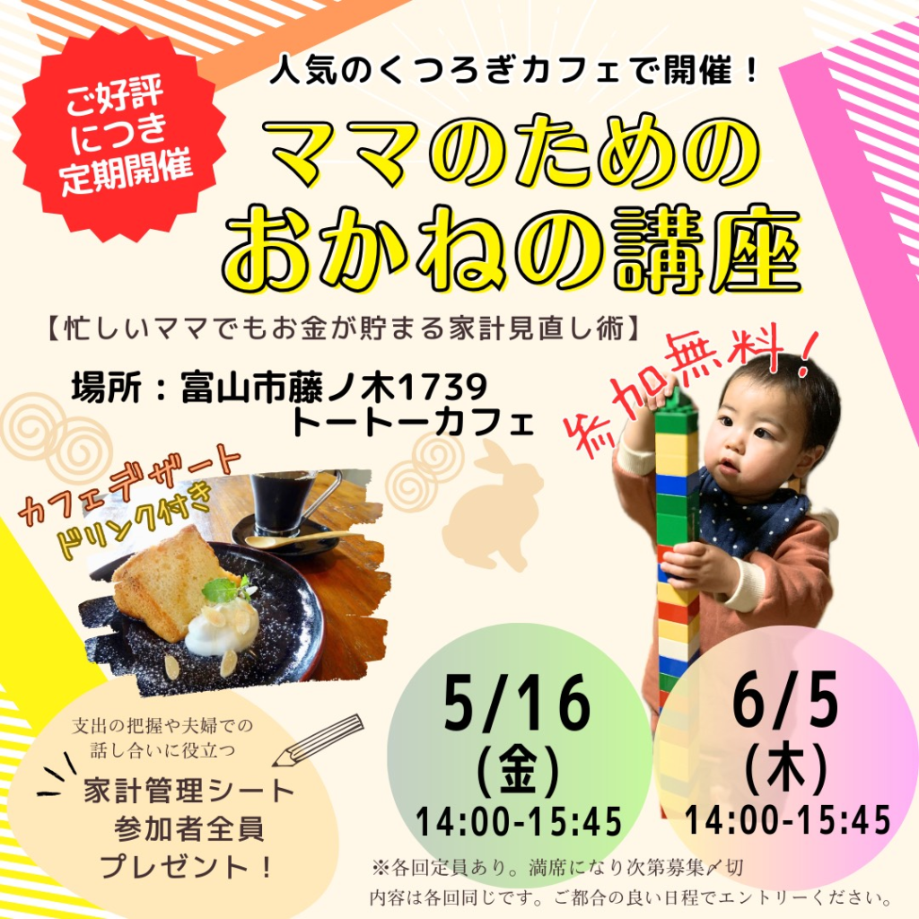 イベント案内 【参加無料】ママのためのおかねの講座/富山市 \子育てママ必見/お金についての知識や活用できる制度について学べるセミナーを開催します。参加無料!カフェデザート付きが嬉しいセミナーです。お子様連れでもお気軽にご参加ください。 ママ友にはちょっぴり聞きづらいお金の話。この機会を知識のアップデートにぜひ活用してくださいね。 お申込みはこちら... famille