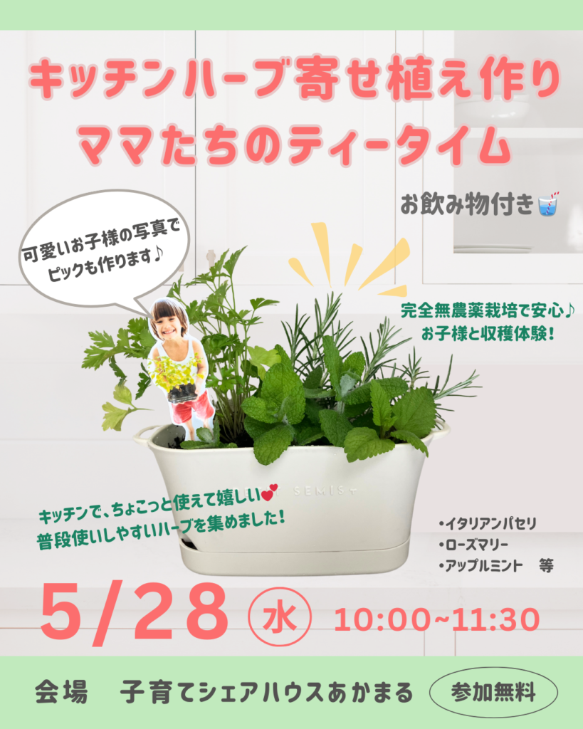 イベント案内 【参加無料】キッチンハーブ寄せ植え作り・ママたちのティータイム/高岡市 キッチンハーブ寄せ植え作り・ママたちのティータイム お料理にちょこっとハーブを添えると オシャレになりますし 風味も一段とアップしますよね♪ 今回は、育てやすく、 普段使いしやすいハーブを 寄せ植えにしてみましょう! 育て方やお料理での使い方もお知らせしますよ! 完全無農薬栽培で育ててい... famille