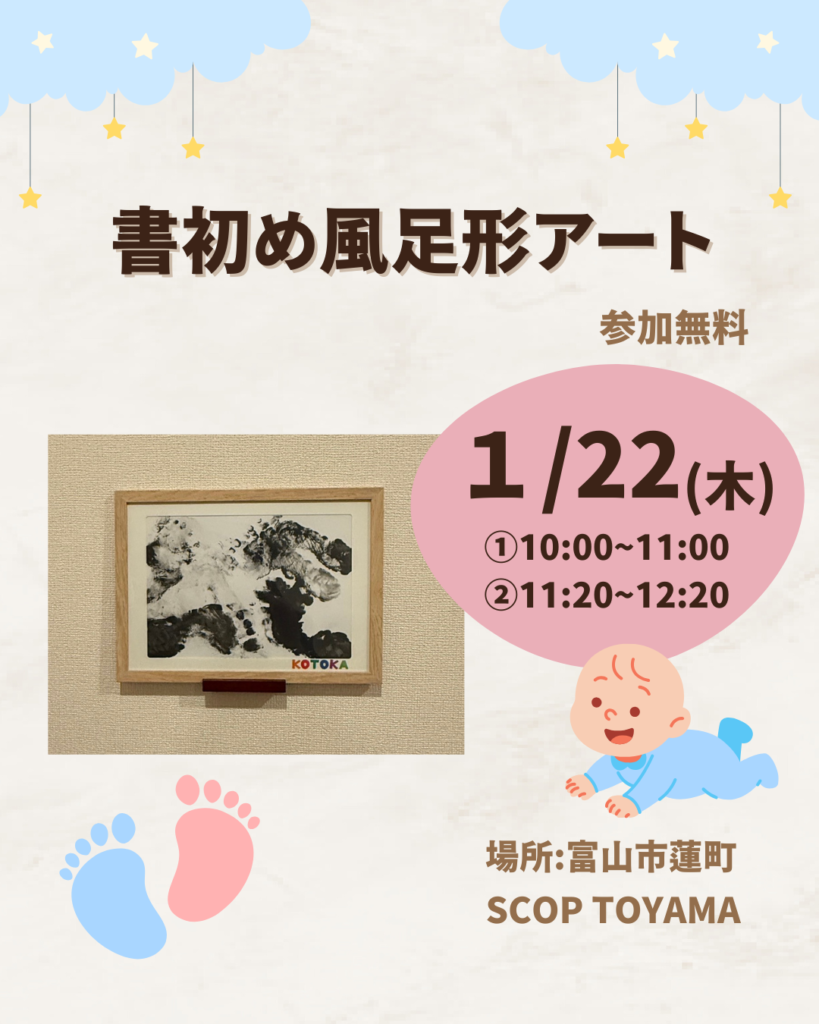 イベント案内 【参加無料】書初め風足形アート/富山市 参加無料! 書初め風 足形アート ぺったん、ちいさなあんよで 新しい一年のはじまりを記念に! 書初め風デザインに 赤ちゃんの足形をぺたっ 当日はカラーも選べます! 今だけの「かわいい」を 親子でたのしく残しませんか? 簡単なアンケート回答で参加は無料! 内容 ... famille